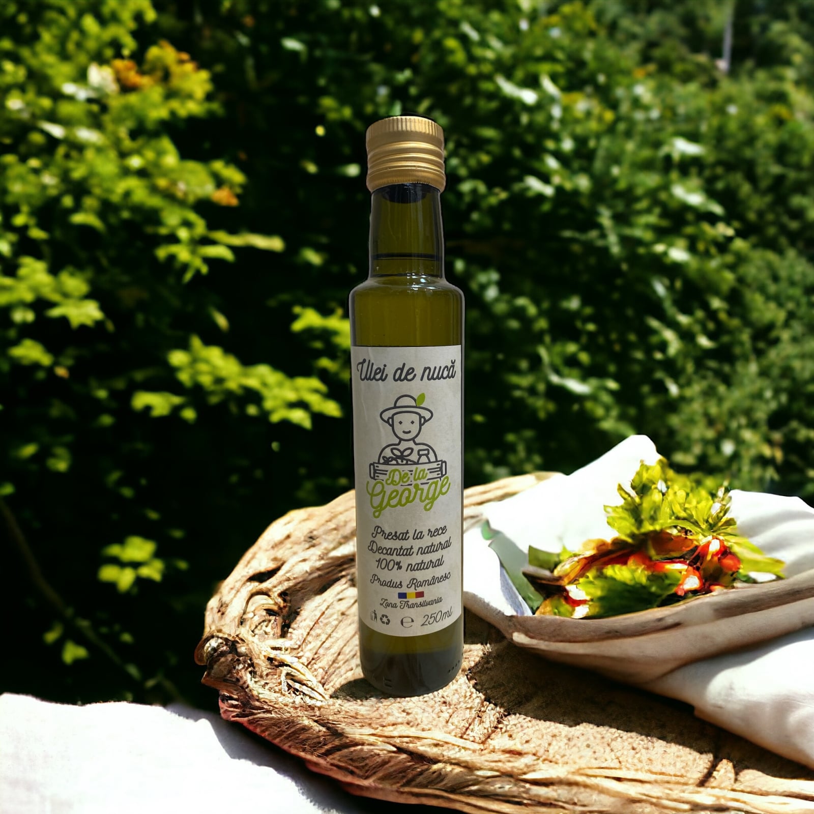 ~Este un produs 100% natural,obtinut prin presarea blanda,la temperaturi scazute,a miezului de nuca.Aceasta metoda pastreaza integral gustul autentic,valoriile nutritionale si aromadelicata de nuca coapta.