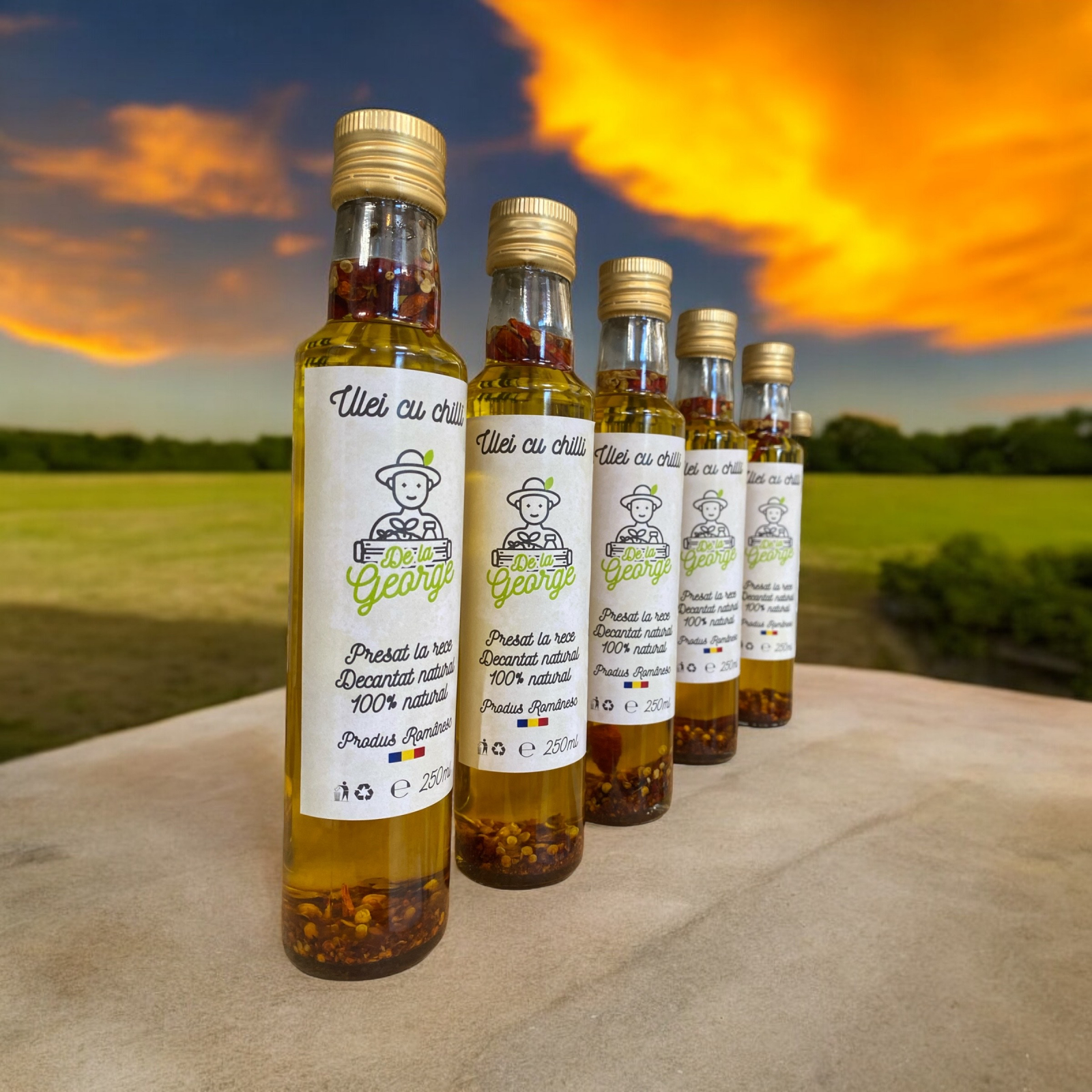 ~Un ulei cu atitudine!Obtinut prin presare la rece a semintelor de floarea-soarelui romanesti,apoi infuzat natural cu ardei chili uscat-pentru un gust intens,echilibrat,cu un final picant care nu trece neobservat.